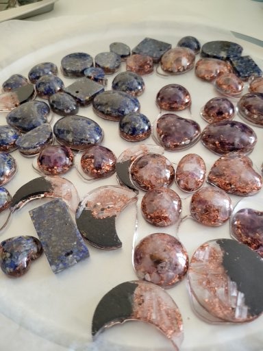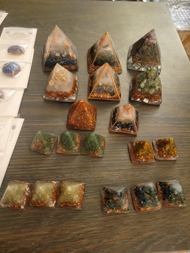 Each peace of orgonite that I create, is set with the intention to help anyone raise their own vibration. They are all infused with reiki and unconditional love. High vibrational music is played during the curing process. Each piece is unique in the way that no 2 pieces are exactly alike. I have a wide variety of pieces from palmstones, pendents, and pyramids.